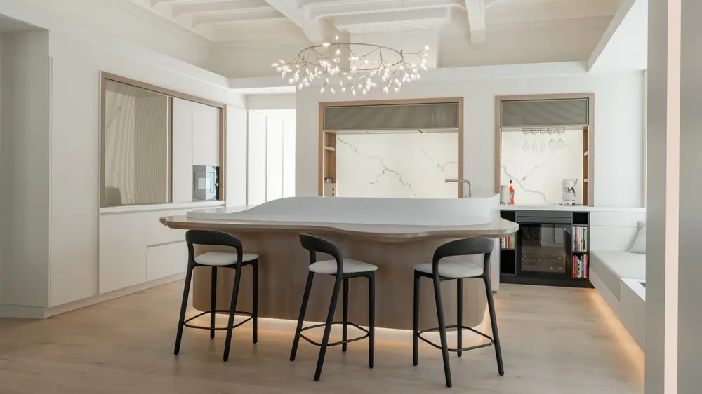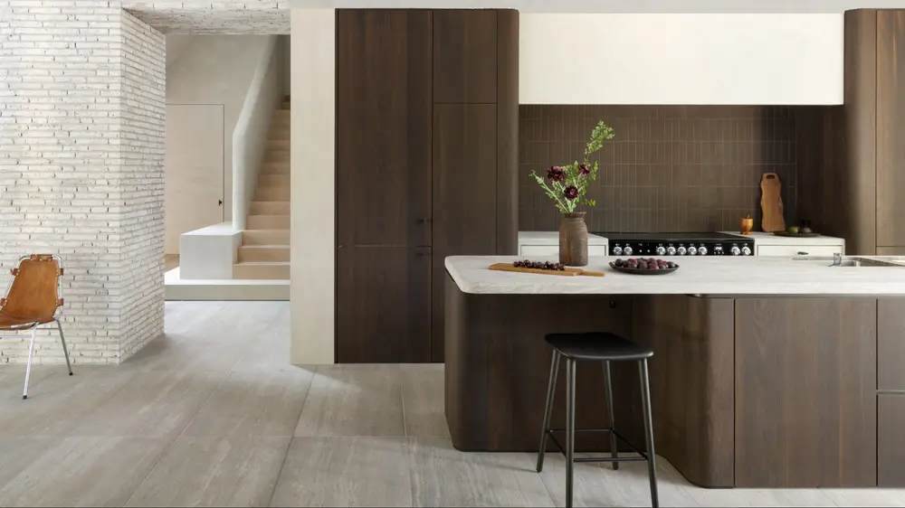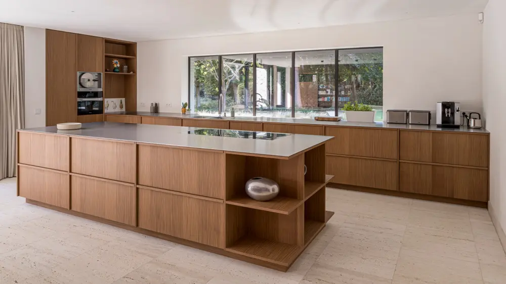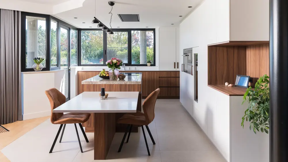 Deze maatkeuken van Silva combineert moderne eenvoud met natuurlijke warmte. Het ontwerp verenigt witte, greeploze kasten met houtfineer in Amerikaanse notelaar en een natuurstenen werkblad in kwartsiet Taj Mahal.
