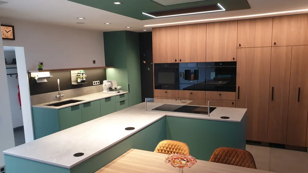 In Wachtebeke realiseerde De Vriese Bert een opvallende keuken die lef en verfijning combineert. Het project onderscheidt zich door zijn gewaagde groene kleur in combinatie met warme houtaccenten.